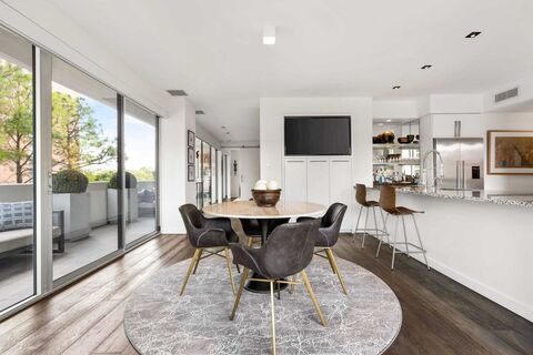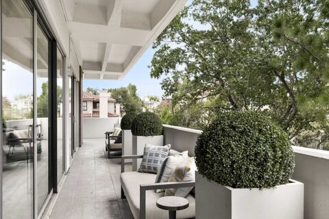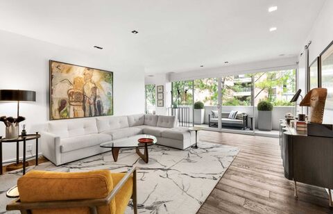 Expertly designed and extensively renovated by an interior designer, this rare one-bedroom, one-and-a-half bath corner unit at The Gold Crest offers a striking blend of architectural significance and luxury. Perched at tree level with walls of floor-to-ceiling glass, this sophisticated home wraps you in natural light and curated detail. The expansive wraparound terrace creates a seamless indoor-outdoor flow, ideal for entertaining or quiet mornings by treetops. Details include: Venetian plaster, custom art lighting, and electric shades which elevate the aesthetic with understated elegance, updated sliders throughout. The open-concept kitchen is perfectly tailored for modern living. A spacious living and dining area is grounded by rich oak hardwoods, while a separate entry gallery offers additional space for display or quiet transition. The primary suite is a serene retreat, complete with a stunning marble bath that includes a soaking tub, dual sinks, a separate rain-head shower, and a