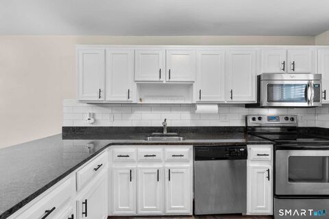Welcome to easy living in the heart of Springdale, one of Stamford's most vibrant and convenient neighborhoods. This beautifully maintained condo offers the perfect blend of comfort, style, and convenience - just minutes from the Springdale Metro-North station, shopping, dining, and local favorites like Humbled Coffeehouse right down the street. Step inside to an inviting open-concept main level featuring hardwood floors, recessed lighting, and a cozy gas fireplace that anchors the living space. The dining area flows seamlessly into the updated kitchen, complete with white cabinetry, granite countertops, subway tile backsplash, stainless steel appliances, and a breakfast bar ideal for casual dining or entertaining. Upstairs, you'll find spacious bedrooms filled with natural light and generous closet space. A convenient in-unit laundry adds everyday ease. The home also includes an attached garage plus additional parking - a rare and valuable feature in this area. Enjoy morning coffee on