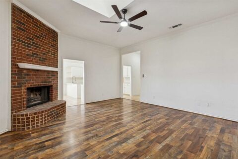 Tucked within the highly desirable Century Oaks neighborhood, this charming single-story brick home blends traditional style with a functional, well-designed floorplan. Mature trees and landscaping create curb appeal and a warm welcome. Step inside to a light-filled interior where large windows and skylights flood the home with natural light. The updated kitchen is the heart of the home, featuring quartz counters, stainless steel appliances, and generous prep space. Open to the formal dining room, it creates an ideal setting for entertaining, while a cozy breakfast nook offers additional dining space in the kitchen. The living room centers around a wood-burning fireplace and offers direct access to the spacious backyard. The oversized primary suite easily accommodates a king-size bed and serves as a private retreat. An en-suite bath features dual quartz vanities, a separate soaking tub and shower, and dual closets. Two additional bedrooms and a second full bath provide flexibility for