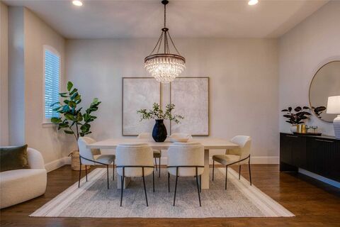 Perched high on a hillside overlooking the glittering skyline of Downtown Dallas, this stunning three-level residence captures the essence of elevated, urban living. Offering the largest floor plan in the community, it blends generous space with effortless sophistication and breathtaking views. A gracious formal dining room welcomes you in, where a sweeping staircase with cascading illumination sets a dramatic, unforgettable tone. Soaring 11-foot ceilings draw you into the heart of the home - an open-concept kitchen and living space designed for connection, celebration, and quiet everyday moments. A chic powder bath on the first level adds thoughtful convenience for guests. The chefs kitchen features a GE appliance package, gas cooktop, abundant storage, and an expansive island that anchors the space with style and function. The living room showcases a dramatic floor-to-ceiling stone gas fireplace and opens to a generous outdoor entertaining area, perfect for unforgettable Texas sprin