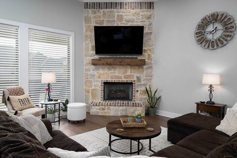 Welcome to this beautiful home in ideally located Oak Creek, which offers the perfect combination of comfort, beauty, and style. Built in 2021, this three bedroom, two bath, plus office property is in pristine condition and move-in ready. Stunning hardwood floors throughout the home and neutral tones throughout create a bright, welcoming atmosphere. The kitchen boasts a 5 burner gas cooktop, ample stacked cabinetry to the ceiling, and beautiful marble countertops, huge island with bar seating, under and in cabinet lighting, and a spacious pantry. In the living area, a floor-to-ceiling stone and brick fireplace adds elegance and warmth. The home features two guest bedrooms with custom walk-in closets and a spacious guest bath that includes a lovely tiled tub/shower, and a built in linen closet. The luxurious primary suite offers an expansive dual vanity, an oversized walk in closet, linen closet, a zero entry walk-in shower with two shower heads, and a relaxing freestanding tub. The d