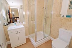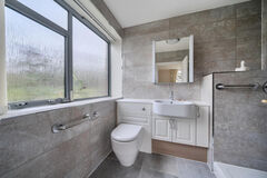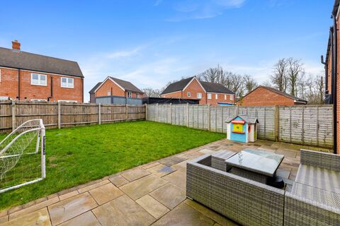 Upstairs, the primary bedroom serves as a private sanctuary with its own stylish en-suite shower room. Three further well-proportioned bedrooms share a modern family bathroom finished with neutral tiling. Outside, the rear garden is mainly laid to lawn, providing a private backdrop for alfresco dining on the stone patio while taking in the neighbouring greenery.