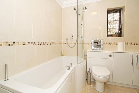 2.57m max x 2.02m max (8'5 x 6'8) white shower bath with mixer tap having built in shower and hinged screen over, low level wc having fitted cupboard to one side, wash basin with mixer tap, tiled walls, chrome heated towel rail, tiled floor, double glazed window to side