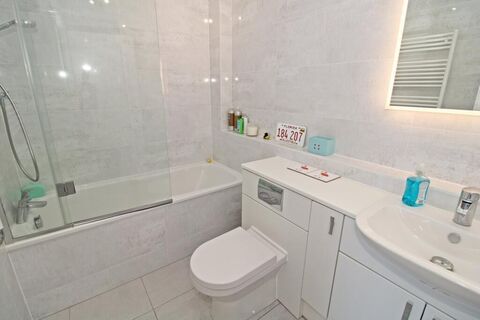 2.74m x 1.8m (9'0 x 5'11) white bath with mixer tap having built in shower and hinged screen over, low level wc, recessed wash basin with mixer tap having cupboards beneath, tiled walls, heated towel rail, tiled floor, extractor fan