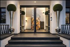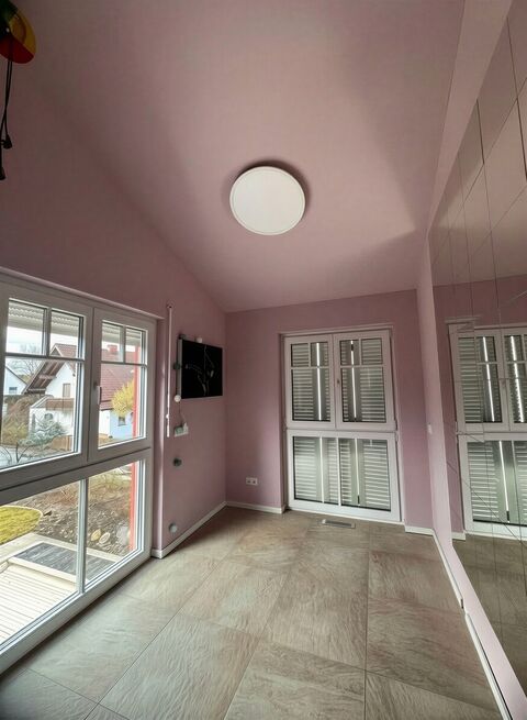 im Winter sorgt ein hochwertiger Kamingrundofen mit beidseitigem Blick fur gemutliche Atmosphare. Die Wohnraume uberzeugen mit teils weissen Holzvertafelungen, exklusiven Designertapeten, apricotfarbenem Esszimmer mit Poolblick, Rundbogenfenstern im Wohnzimmer sowie hochwertiger Kuche mit schwarzen Metrofliesen und beleuchtetem Lichtband. Ein separater TV-Raum mit 65-Zoll-Flatscreen ist ebenfalls vorhanden.