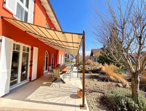 Der liebevoll angelegte Wohngarten mit drei grossen, uberdachten Terrassen (Ost, Sud, West) ladt zu jeder Tageszeit zum Verweilen ein. Morgens geniessen Sie ihr Fruhstuck auf der 7 m breiten Ostterrasse, abends den Sonnenuntergang auf der 10 m breiten Westterrasse.