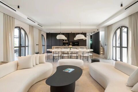 The villa features a spacious, light-filled living room with an open kitchen—perfect for entertaining—a stunning master suite with sea views, and five additional spacious bedrooms, each providing absolute comfort.