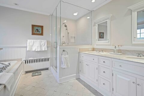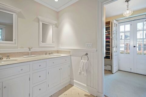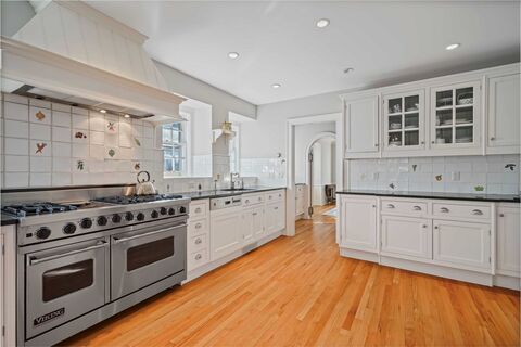 One of Pelham Manors most admired homes, this solid stone Colonial, designed by renowned architect Charles M. Hart, exudes charm and grace with incredible curb appeal, perfect proportions, and sophisticated European interior accents. Center hall foyer with graceful staircase and convenient powder room opens to formal living room and adjoining sunroom with marble floor, each with a wood-burning fireplace showcased by a custom and an antique marble mantle. Formal dining room with built-in china cabinet connects to butlers pantry with back staircase. Renovated and expanded kitchen with cathedral ceiling breakfast and family space, granite counters, professional range, two sinks and other high-end appliances. Second floor master bedroom with dressing room and spa-like bathroom with two sinks and separate shower and soaking tub. Bedroom and hall bath, custom study with built-in bookshelves (previously a bedroom), and office/nursery on second floor plus third floor with two bedrooms and tw