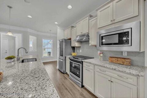 Pristine ''move-in'' condition Steel Creek Plan, Causal open floor plan, spacious living area with an extended open sunroom , beautiful kitchen with a large granite center island with designer backsplash, an abundance of cabinets, pantry, stainless appliances, gas 5 burner range/oven, refrigerator (2020) remains, microwave (2024) breakfast nook, spilt bedroom plan, large primary suite has double vanity sinks, large tile shower with frameless door, tile floor, wonderful walk-in closet, laminate wood flooring in all areas with exception of tile in baths, two car garage has pull down attic storage, relax in the screened porch overlooked the woodsy buffered rear full of birds or enjoy a cookout on the rear patio, the exterior just freshly painted in 2026, the interior painted 2026 so a huge expense one will not have to incur, the home is equipped with roll down hurricane shutters (original value of $10,700). natural gas water heater, laundry sink in garage, laundry room has upgrade of