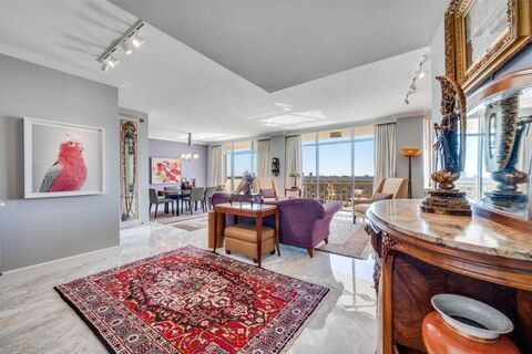 This spectacular condo in the iconic Preston Tower offers luxury living at its best. Perched on the twelfth floor, the residence enjoys unobstructed, breathtaking views of the treetops of the Park Cities and the Downtown Dallas skyline. A generously sized terrace provides the perfect setting for morning coffee, al fresco dining, or evening cocktails and enhances an interior that lives larger than its actual square footage.The home has been fully updated with impeccable finishes throughout. Beautiful large-scale porcelain tile flooring, designed to resemble marble, flows seamlessly from the interior to the terrace, creating a sophisticated indoor-outdoor living experience. Large windows flood the space with natural light, while a long hallway wall with custom cabinetry and shelving offers exceptional storage and display space.The well-designed floor plan includes three bedrooms and two full baths. The spacious primary bedroom easily accommodates a sitting area. One bedroom is cu
