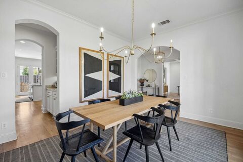 Stunning Tudor-style traditional home in a sought-after neighborhood feeding to White Rock Elementary and just moments from the scenic White Rock Lake trails. Soaring ceilings, rich hardwood floors, custom cabinetry, graceful arched openings, and beautiful brickwork create a sense of timeless character throughout. The chefs kitchen opens seamlessly to the main living area, where natural light pours in and extends to the covered outdoor patio, perfect for effortless indoor-outdoor living. Three fireplaces add warmth and charm, anchoring the formal den, main living room, and outdoor patio. An upstairs living or flex space offers a quiet retreat or creative escape. The upstairs primary suite feels like a private sanctuary, complete with an expansive closet and direct access to the upstairs laundry room. A sliding gate at the rear adds both privacy and convenience, completing a home that blends classic architecture with inviting, livable elegance.