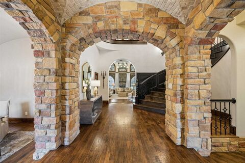 Situated on a .940 acre lot within a neighborhood setting, this custom-built, original-owner estate offers 7,339 square feet of refined living across two levels. Designed with architectural distinction and exceptional craftsmanship, the home features six ensuite bedrooms and two additional powder bathrooms. The stone-accented foyer with brick groin vault ceiling opens to a courtyard with gas fireplace and iron security gate. Six fireplaces are thoughtfully placed throughout the home. The family room showcases a cathedral ceiling with exposed beam accents, built-in cabinetry, custom mantel, and a wine cellar with refrigerator. The kitchen is appointed with granite countertops, 48-inch Thermador gas range, double ovens, built-in refrigerator , pot filler, copper apron-front double-basin sink, under-cabinet lighting, built-in desk, and walk-in pantry. The owners suite features a vestibule entry with dome ceiling and mosaic tile medallion, tray ceiling with accent lighting, elevated sitti