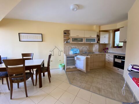 The apartment is with an area of 80 sq.m. It consists of an entrance hall, a spacious living room with kitchen and dining area, one bedroom, one balcony with pool view and second balcony with mountain view, a bathroom with shower cabin, toilet and sink. The apartment is ideal for holidays, permanent living and rental.