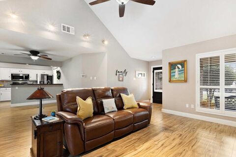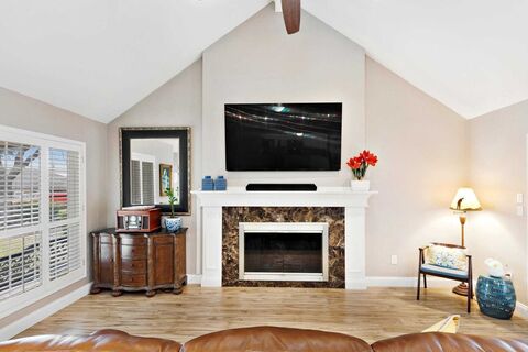 Charming, low-maintenance 2-bedroom, 2-bathroom home with beautiful pond views! This home includes charm, livability, and peace. Imagine peaceful mornings overlooking the water right from your bedroom, and a private door in the primary suite for easy backyard access. The home features bright vinyl plank flooring throughout, an updated eat-in kitchen and bathrooms, and a floored, insulated attic for added space and energy efficiency. Every detail from planation shutters, gas fireplace, and added ceiling fans to indoor and outdoor spaces have been thought of. Outdoor living is a dream with multiple covered porches, a wooden deck, and a board-on-board privacy fence. The backyard requires no grass maintenance, and the HOA handles both front and backyard upkeep, making this home easy and enjoyable to live in. You do not want to miss this home.