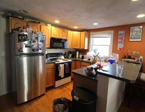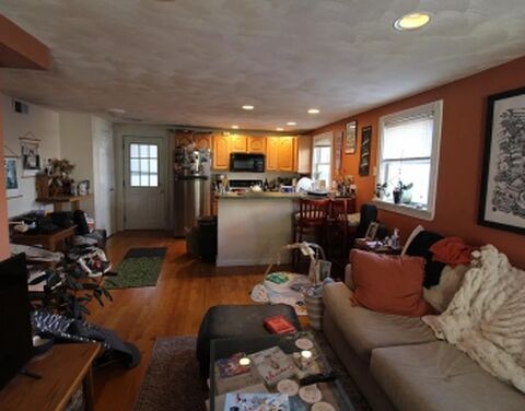 Set back from the street, quiet, back porch and shared back yard. Open living room and galley kitchen, two bedrooms, full bath, nice hardwood floors, recessed lights, modern finishes, central AC. 5 min walk to the Union Square T.