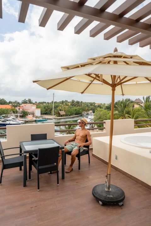 Rooftop Jacuzzis with marina views.