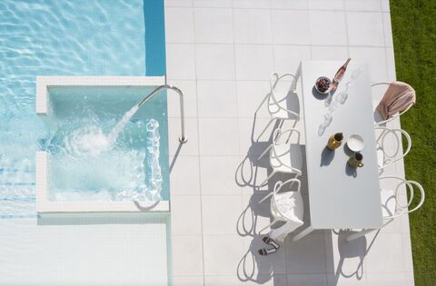 its upper terrace, flanked by bamboo, is an ideal place to lie in the shade and gives privacy to the bathing area, which is surrounded by the leafy garden