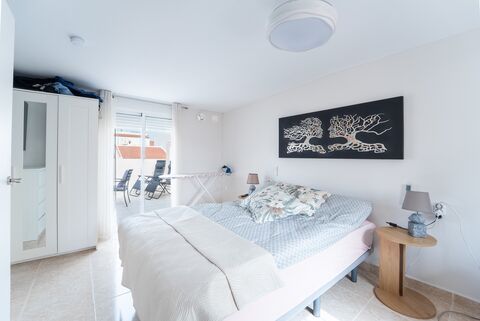 Next to the kitchen is a room that is currently used as a TV room, but which could easily be used as a bedroom, guest room or home office. On the entrance floor there is also a built-in patio where the washing machine and water heater are installed, conveniently and discreetly placed.