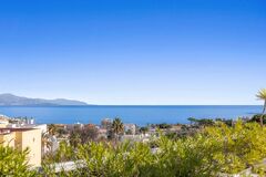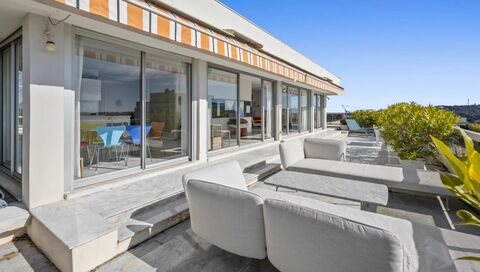 it opens onto a huge 255 m2 terrace, revealing a 360-degree panoramic view of the sea, the Cap d'Antibes, and the mountains. The bright living room, extended by a fully equipped open kitchen, creates a friendly and harmonious space.
