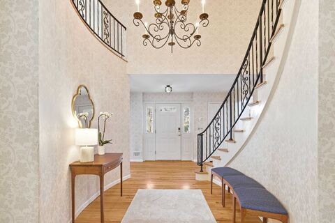 Set on a level half-acre in a coveted Fox Meadow neighborhood, this sun-filled 5-bedroom Colonial offers an exceptional layout for todays living. The two-story central foyer sets the tone for the homes open and welcoming atmosphere. Ahead is the inviting family room with custom woodwork and a wood-burning fireplace, which flows seamlessly into the eat-in kitchen with custom cabinetry (remodeled 2011), creating a warm and functional heart of the home. Well-proportioned living and dining rooms with bay windows provide elegant spaces and flexibility for gatherings large and small. The kitchen and back door open to a low-maintenance deck overlooking the level private backyard ideal for everyday enjoyment and entertaining. A practical mudroom with first-floor washer and dryer adds everyday convenience. The second-floor features four spacious bedrooms, including the primary bedroom with balcony and ensuite bath, plus a dedicated home office. Additional highlights include a first-floor fl