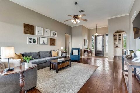 Enjoy one of the most breathtaking views in Fort Worth! Perched on a hillside overlooking Eagle Mountain Lake and the rolling Fort Worth landscape, this stunning single-story home is located in a gated community featuring a pool, park, playground, and serene ponds. The kitchen offers granite countertops, a walk-in pantry, and abundant storage. Two dining areas include a formal dining room with dual built-in hutches. A secondary living area features a built-in desk, perfect for a home office or study space.The home boasts a split-bedroom layout, soaring ceilings in the main living area, and a spacious open entry hall. The primary suite is generously sized, with large windows showcasing the beautiful backyard and sweeping views. The en-suite bath includes a relaxing garden tub and separate shower. Two additional bedrooms are situated on the opposite side of the home near the oversized three-car garage. Covered front and back porches provide ideal spaces to enjoy the scenery. Conven
