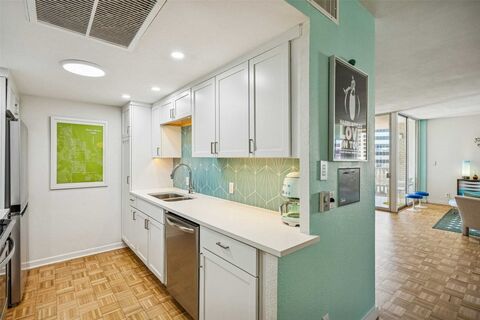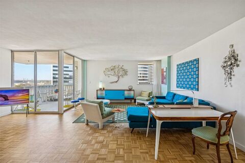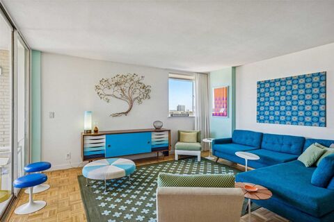 Positioned on the coveted 12th floor the buildings sub-penthouse level at Turtle Creek North, this rare corner residence captures the tailored glamour of the early 1960s with cinematic North facing Highland Park views. Updated in 2022 with stylistic sensitivity to its mid-century roots, the home blends old and new seamlessly. Original parquet wood floors grace the formal living and dining spaces, while walls of glass flood the residence with natural light, with Highland Park and Turtle Creek exposures. The stunning kitchen makes a bold statement with quartz countertops, stainless appliances, dramatic backsplash, and floating shelves. Thoughtful nods to the past add personality including a snazzy built-in Caloric Telephone Caddie and subtle retro-inspired details that honor the buildings 1962 heritage. The bath continues the story with classic penny tile and elevated finishes that feel modern, yet subtly nostalgic. Custom blackout blinds and a state-of-the-art ($8,000) smart