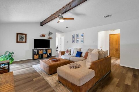 Fantastic 4-Bedroom Garland home near the Duck Creek Greenbelt! This one is all ready to go with luxury vinyl plank flooring throughout the entire home. Beautifully remodeled kitchen with thoughtful upgrades, breakfast bar, gas cooktop and oven, stainless dishwasher, and white Corian countertops which all give it a classic tasteful look. Large walk-in pantry and utility room off kitchen. The spacious living room with brick fireplace and vaulted ceilings is the center of the home and has an updated bar for coffee or cocktails. Bonus office is your perfect flex room just off the living room and leads to back patio area. The roomy primary suite is accented by a vaulted ceiling and seamlessly connects to the primary bath with two updated vanities just installed, and two walk-in closets. Spacious bedrooms and closets make this very valuable for your needs. This home has delightful drive-up appeal with its soft-contemporary exterior. Come see why you will love it!