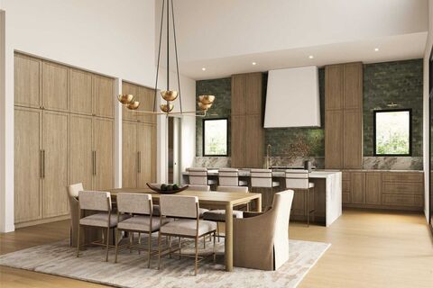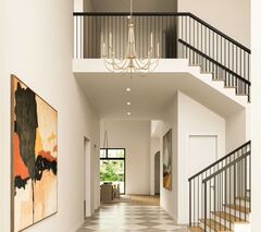 Welcome to this exceptional residence on a premier street in Midway Hollow where timeless architecture meets refined contemporary living. This thoughtfully designed home offers expansive open spaces, soaring ceilings, and high-end finishes throughout, creating a sophisticated yet comfortable environment ideal for everyday living and entertaining. From the moment you enter, you are greeted by a dramatic two-story foyer featuring a striking staircase with black iron balusters, and a statement chandelier that sets the tone for the homes elevated design.Open-concept living and large dining area are anchored by a designer fireplace and framed by large windows that flood the space with natural light. The chefs kitchen is a true showpiecefeaturing custom cabinetry, a stunning island, premium appliances, designer lighting, and an oversized walk-in pantry, prep kitchen for effortless entertaining. The luxurious primary suite offers a serene retreat with views of the backyard, a spa-inspire
