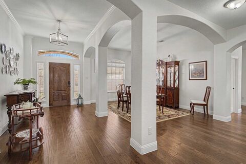 Stunning Single-Story on a Third-Acre Lot with a True Backyard OasisWelcome to effortless living and exceptional entertaining on a gorgeous, oversized lot. From the moment you arrive, the swing driveway and striking curb appeal create a memorable first impression.Inside, a thoughtfully designed floor plan balances everyday comfort with seamless hosting. Rich wood floors flow throughout the main living areas, adding warmth and timeless elegance. The kitchen, open to the breakfast area and den, is as functional as it is beautiful, featuring handy step-in pantry, stainless steel appliances, and a gas cooktop, perfectly designed for both organization and performance.The spacious primary suite is a peaceful retreat with room for a seating area. The ensuite bath is complete with separate bath and shower, 2 sinks, loads of counter space and private toilet room. With the large walk-in closet off the back, this bathroom provides a serene space to begin and end each day.Step outside and