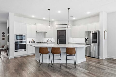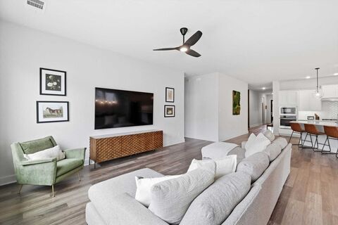 Welcome to 609 Arden, a lovely 4-bedroom, 3-bath home with a versatile bonus flex space perfect for a playroom, home office, or relaxation retreat. Thoughtfully designed with minimal carpet, the home features luxury vinyl plank flooring throughout the main living areas and primary suite, with carpet reserved only for the secondary bedrooms.Energy efficiency meets everyday comfort with owned solar panels, helping keep utility costs low while providing peace of mind. Additional upgrades include an epoxied garage floor, tankless water heater, designer lighting, built-in shelving, and flat-screen wiring for easy living.Enjoy outdoor living with covered front and back porches overlooking lush native landscaping, all nestled within a charming community filled with amenities. Residents enjoy access to parks, scenic trails, pools, pickleball courts, on-site elementary (open now) and middle school, Floyd Barksdale Middle (opening in fall 2026) and more, making it easy to live, play, and con