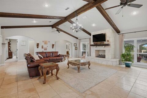Spectacular Spanish style home on hilltop overlooking 40 acres.. Open floor concept. Travertine tile is throughout home for that special touch. Living area has floor to ceiling wood burning Rock fireplace. Open-concept kitchen flows into the living area where beautiful wooden beams grace the ceiling, framing the breathtaking floor to ceiling rock fireplace. The master suite, with a private office and spa-like bath is a tranquil retreat. Home built with 28 piers in slab foundation. Step outside your master bedroom and you have an open courtyard with a second big rock fireplace for your outside entertaining pleasure. Nestled atop a serene hilltop over looking 40 acres of private, wooded land with a pond. Spanish-style estate offers the ultimate in luxury and family living. Located in Bells ISD.
