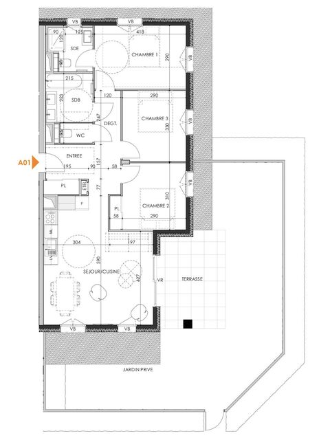 This apartment (A01) is located on the ground floor. It is 77.42m2. The apartment includes an entrance, open plan living/kitchen/dining room with access to the large terrace (13m2) and private garden, 3 bedrooms, 2 bath/shower rooms and a separate WC. The terrace is South-East facing.