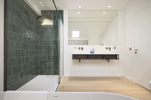 im Obergeschoss, das uber eine aussergewohnliche Treppe erreichbar ist, befinden sich zwei reprasentative Schlafzimmer, die jeweils uber ein grosszugiges Badezimmer und einen begehbaren Kleiderschrank verfugen.