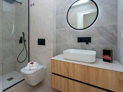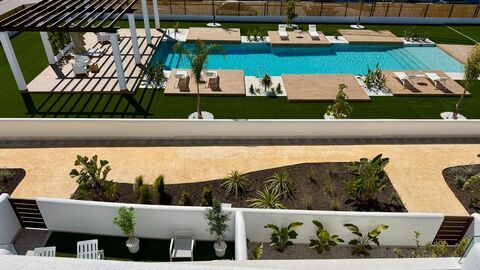Ground floor corner apartment with terraces on 3 sides total 129 m2. Some photos might be from an apartment with slightly different layout.The development got a large communal area with a large pool included shower and toilet facilities. Allocated covered parking (with solarpanels on top for community electricity). Pre-installation for electric car charging.3 bed, 2 bath. This fantastic apartment is in the Serena Golf area of Los Alcazares. Apartment consist of lounge with open kitchen and access to the large terrace/garden via large sliding glass doors.3 nice bedrooms, with build-in wardrobes. The largest one also got en-suite bathroom.Key features:- Walkable distance to golf.- 3 bedrooms.- 3 terraces/garden.- Heat pump, 110 l tank for hot water.- Pre-installation for ducted aircon..- Build-in wardrobes- Large communal pool.- Kitchen comes with induction hob and extractor.And a bit about distances:- Beaches and marina approx 1,500 meter- Town approx 1,400 meter.- Golf 800 m, 2 more in approx 5 km..- Supermarked 1000 m.- Nearest restaurant 200 m..- Padel tennis and other sports 500 m.- Airports: Murcia 30 minuter, Alicante 55 minuter.- Cartagena 15 minutes, Murcia City 35 minutes, Torrevieja 40 minutes.