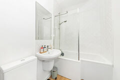 shower over. Pedestal wash hand basin and a low flush toilet. Heated ladder