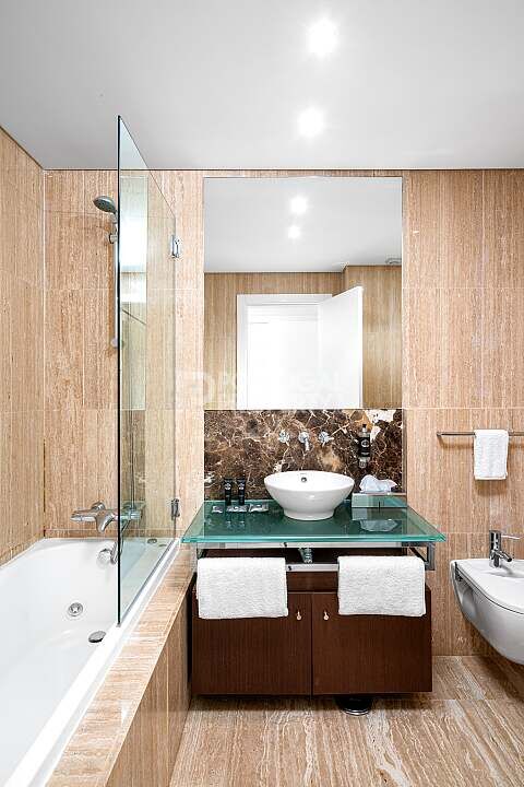 The apartment is fully furnished and equipped, featuring an open-plan living and dining area, air conditioning, underfloor heating, and seamless access to the spectacular terrace.