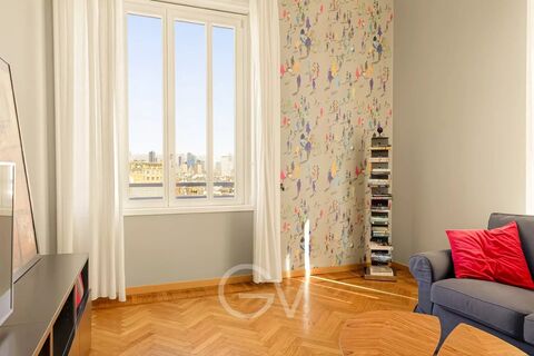 gv1379 - Galleria del Corso, apartment - Bright and panoramic apartment a few steps from the Madonnina. Located on the 9th floor, the apartment offers an area of 81sqm characterized by great brightness and a wonderful panoramic view of the city, passing from City Life to the mountains. The renovation, enhanced by careful finishes and advanced systems, involved the new handcrafted glazings, the original parquet from the '30s, preserved in almost all rooms except the kitchen and bathroom, the motorized aluminum shutters, home automation and complete wiring. Inside, colour becomes an architectural element: warm and bright shades accompany the paths and define the rooms without ever being invasive, creating a coherent and recognizable whole. The ceilings up to 3.77 meters high help to reinforce the quality of the rooms. The entrance leads into an articulated and well-distributed space, with a hallway that disengages all the rooms and integrates a comfortable and discreet vestiere. Th...
