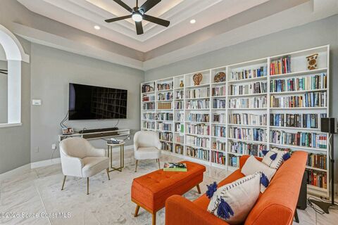 Discover an extraordinary lakefront estate in the Legends at Suntree. Offering 4,449sq ft of refined living space with sweeping views of Arnold Palmer Challenge Golf course.5 bedroom 3.5 bath residence blends grand scale with elegant design. Beginning with a dramatic 16' foyer and soaring 12-14' ceilings throughout accented by tray ceilings in the primary suite, living, family and dining rooms this home is designed for both sophisticated entertaining and everyday comfort. The home features a private library, media room and open living flow that captures stunning water and fairway vistas. The chef kitchen is beautifully appointed with quartz countertops a striking waterfall island and GE Cafe appliances. The luxurious primary suite offers a slipper tub, oversized walk-in shower and expansive his and hers closets. Outdoors a resort style pool and screened lanai overlook the tranquil lake and golf course scenery, completing this exceptional three-car garage estate. Renovations done in 20
