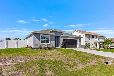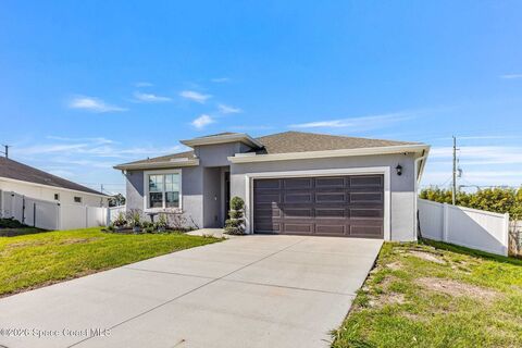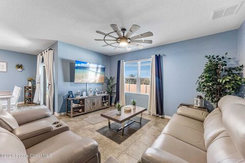 Beautifully maintained newer home in desirable SE Palm Bay, offering comfort, privacy, and smart home convenience. This property features all systems 2021, a fully fenced vinyl backyard w/ no rear neighbors, providing peaceful views & added privacy. The spacious yard also includes a detached accessory building/shed and a covered porch perfect for relaxing or entertaining.Inside, you'll find tile throughout the home with LVP flooring in the bedrooms, elegant 42-inch cabinetry, and a convenient breakfast/sandwich bar that opens to the living area. The living room is highlighted by a 60-inch ceiling fan, creating a comfortable space to gather.The primary suite offers a glass-enclosed shower, walk-in closet plus an additional closet, and a private water closet for added functionality. The home also includes indoor laundry and a freshly painted interior.Modern upgrades include a smart security and entry system featuring ADT security, Ring cameras, and Google door entry.