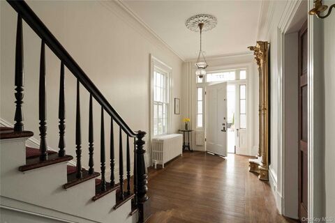 Welcome to The Reeve House, a circa 1836 Italianate residence set on a rare triple lot in Newburgh's East End Historic District. One of the earliest homes built on Grand Street, the three-bay-wide wood-frame dwelling has pilastered corners, a front door flanked by sidelights and transom, and a bracketed cornice that speaks to the craftsmanship of its era. Built by George and Caroline Reeve, a family of prominent silver merchants, the residence has original silver door knobs and hardware from the period still in place. The property was willed to a neighboring church in the early 20th century, and served as the official rectory for over fifty years, a period of institutional stewardship that accounts for the home's extraordinary state of preservation. That unbroken chain of care is written into every preserved detail: black and white marble mantels, oversized moldings and plaster medallions on light fixtures, five decorative fireplaces, original windows with wavy glass, cast iron radiato