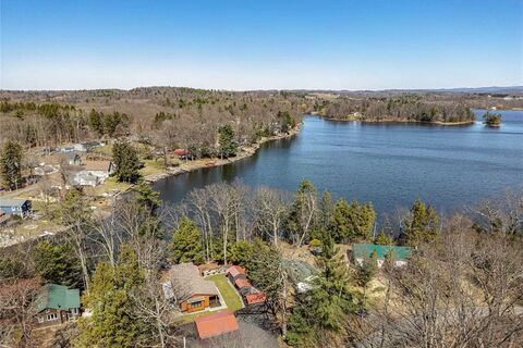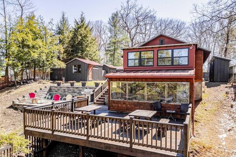 Welcome to Tansy Cottages at Kinderhook Lake, a circa 1920s waterfront compound on the shores of Kinderhook Lake in Columbia County. With 81 feet of private frontage and a brand new boat dock, life here unfolds across three distinct tiers: a main living level, a bluestone terrace with an outdoor seasonal kitchen, and a beachfront dock level. Five structures in total, including the main cottage, three cabins, and a detached two-car garage, create a flexible compound suited for a retreat, a creative hideaway, or an income-producing vacation rental. The main cottage carries the vintage character of a 1920s lake house: tongue-and-groove ceilings, original light fixtures, and a refurbished vintage cast iron sink, brought fully up to date with central air, underground electrical, and modern finishes that add comfort without compromising character. The single-level layout opens into a generous dining area that flows into the updated kitchen, appointed with soapstone and quartz countertops.