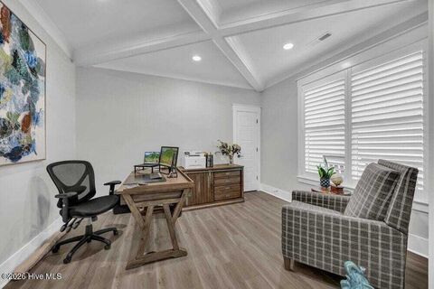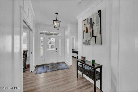 Upgrades abound in this stunning, like-new residence located in the peaceful Osprey Point section of Brunswick Forest. Designed for refined living and everyday comfort, this home offers an open, ideal floorplan with exceptional attention to detail throughout. The gourmet kitchen features beautiful countertops, a 6-burner natural gas range, built-in microwave, soft-close cabinetry, and an expanded working pantry (scullery) with countertop and electric outlet. The sophisticated first-floor Primary Suite includes heated bathroom floors and a tiled zero-entry shower. Two additional bedrooms, a dedicated office/study, laundry room, and convenient drop zone complete the main level. The Great Room showcases a coffered ceiling and natural gas fireplace flanked by built-in bookshelves, while upgraded trim, pocket doors, motorized shades, plantation shutters, and a sunroom elevate the home's design. Upstairs offers two generous flex rooms, a loft area, full bath, multiple closets, and walk-in at