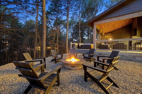 Winterwood Lodge is a spacious two-story cabin located in Pine Lake Resort in Hochatown near Broken Bow Lake and Beavers Bend State Park. Designed as a relaxing retreat within convenient driving distance of the DallasFort Worth area, this 2,934 square foot cabin offers a peaceful wooded setting surrounded by tall pines. The open-concept living area features soaring natural wood ceilings, expansive picture windows, and a floor-to-ceiling stone fireplace that anchors the gathering space. A designer kitchen with stainless steel appliances, granite countertops, and custom finishes provides an inviting space for preparing meals and entertaining. The layout includes three king suites with private bathrooms and a bunk room designed to sleep six, offering flexible accommodations for extended stays or visiting guests.Outdoor living spaces are designed for enjoying the surrounding forest setting. The covered deck includes a hot tub, grill, outdoor seating, and a fire pit area ideal for eveni
