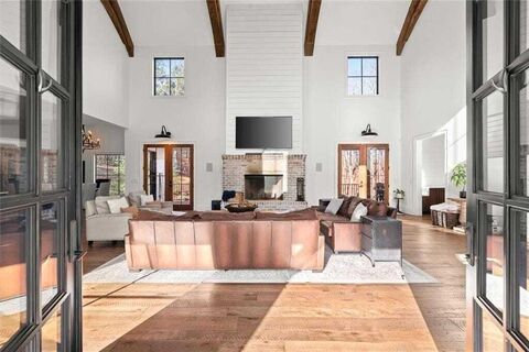On nearly 5 private acres, this extraordinary farmhouse estate offers a rare combination of scale, craftsmanship, and resort style living across nearly 10,000 square feet of remarkable interior space. From the moment you step inside, the home makes a powerful first impression as the breathtaking family room unfolds with soaring ceiling heights that create a dramatic sense of openness, beautifully anchored by striking circular sawn distressed hardwood floors that enhance the custom feel throughout the main living areas. Designed for both everyday living and entertaining, the oversized kitchen is a true showpiece featuring a massive island, exceptional storage, and premium appliances including Sub Zero and Wolf, all flowing seamlessly into an expansive dining room ideal for hosting gatherings. Just beyond the kitchen, a spacious covered back deck overlooks the stunning backyard and provides the perfect setting to relax, dine outdoors, or enjoy the peaceful surroundings. The main level of