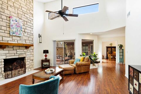 Welcome to 2531 Lake Bed Terrace, a stunning 2-bedroom, 2-bath home in the heart of Carrollton, Texas, showcasing a distinctive mid-century modern design and effortless style. Step inside to a light-filled interior enhanced by beautiful skylights that flood the home with natural light, creating an airy and inviting atmosphere. Clean lines, open spaces, and timeless architectural details define the home while offering comfort and functionality.The spacious living area flows seamlessly into the kitchen and dining spaces, making it ideal for both everyday living and entertaining. This home also features two fireplaces, adding warmth and ambiance throughout.The private primary suite is a true retreat, featuring a spa-like ensuite bath with a massive frameless walk-in shower and multiple shower heads for a luxurious experience. A unique double-sided fireplace connects the primary bedroom and bathroomperfect for cozy, relaxing evenings and keeping warm on chilly winter nights. A generousl