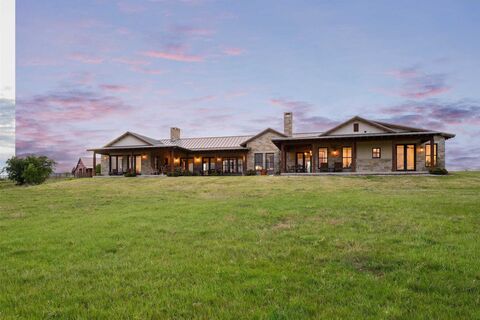 Set on 12.5 picturesque acres in Tarrant County within a private gated community, this extraordinary custom home, built by Dan Thomas Homes, masterfully designed by architect Duke Garwood, offers an unparalleled blend of thoughtful craftsmanship, and serene country living, all just a short drive from Fort Worth. Encompassing 4,329 square feet, this beautifully designed ranch-style home features 5 bedrooms & 4.5 bathrooms, with an open-concept layout that effortlessly accommodates both everyday living & upscale entertaining. The primary suite, office, & great room all showcase dramatic custom Trestlewood reclaimed beams. A stunning handcrafted stone fireplace serves as a focal point in the Great Room, complemented by a second stone fireplace in the kitchen or den, enhancing the homes warmth & inviting atmosphere. The chefs kitchen is outfitted with premium Monogram appliances, a custom-designed walnut butcher-block island, and ample space for gathering. Throughout the home, Kolbe Fren