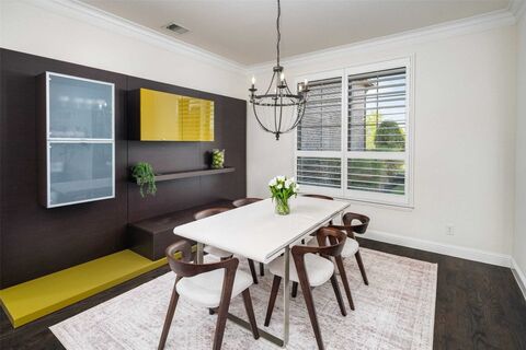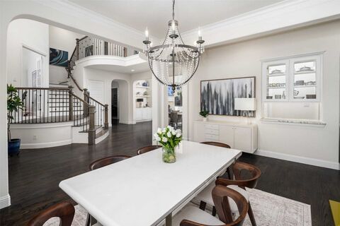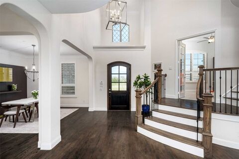 Gorgeous home on 1 acre with model floorplan includes fantastic spaces and finishes + Pool and Outdoor Living and lives beautifully! Soaring ceilings, extensive wood flooring, all ensuite bedrooms + guest suite and Media Room on 1st floor! Huge living room has a vaulted ceiling and is perfect for family gatherings and fun entertaining opens up to the Chef's Kitchen complete large island w-marble countertops, coffee bar area, Butler's Pantry, huge walk in pantry, tons of counter space, + breakfast space all overlooking the sprawling back yard and sparkling pool. 1st Floor Media Room and wet bar creates a fun space for movie nights! Half Bath doubles as a pool bath. Primary Suite is spacious and private w-a spa like bathroom retreat w-separate vanities, soaking tub, walk in shower w-2 shower heads, 2 closets and connects with the Laundry Room. Flex room off laundry room makes the perfect exercise-yoga-craft-homework room. Mud Room off the 4 car Garage keeps everything organized. Off