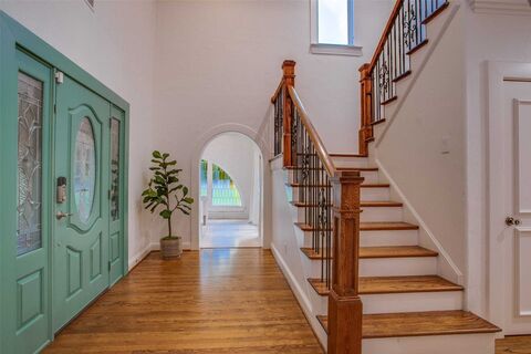 Tucked away on a gated half-acre lot in North Oak Cliff, this Tudor Revival blends storybook charm with thoughtful updates. Stained-glass windows, arched doorways, and coffered ceilings in the formals highlight timeless craftsmanship, while hardwood and tile flooring throughout, plantation shutters, and an original brick fireplace anchor the living spaces. A cathedral-like office or sitting room with vaulted ceilings, exposed beams, and stained-glass windows provides a striking retreat. The bright kitchen boasts a large island, double ovens, walk-in pantry, and oversized, built-in refrigerator. Multiple living areas include an upstairs bonus room ideal as a second living or playroom. The primary suite features a bath with dual vanities, soaking tub, walk-in shower, and walk-in closet. Outdoors, mature trees and wide lawns provide space for entertaining, with the walking trails and playgrounds of Kidd Springs Park just steps away.