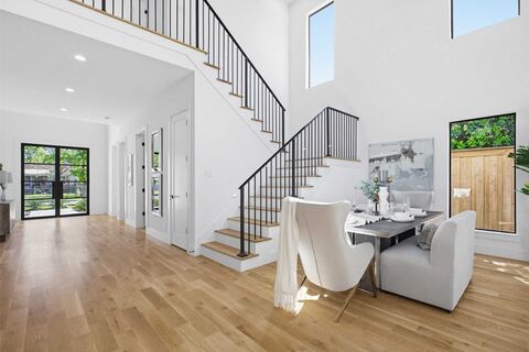 Welcome to this stunning new construction located on a premier street in Midway Hollow showcasing clean architectural lines, curated finishes, and exceptional attention to detail throughout. The striking stucco exterior with bold, black-framed windows creates a sophisticated first impression, while the light-filled interior welcomes you with soaring ceilings, wide-plank white oak hardwood floors, and a seamless open-concept design. The expansive living area is anchored by a dramatic floor-to-ceiling marble feature wall and surrounded by oversized windows that flood the space with natural light. The gourmet kitchen is a true centerpiece, featuring a large waterfall island, quartz countertops, custom rift cut white oak cabinetry, designer lighting, and professional-grade appliances. A separate prep kitchen and walk-in pantry provide added functionality, making this home ideal for both everyday living and entertaining. The private primary suite offers a serene retreat with a spa-inspired