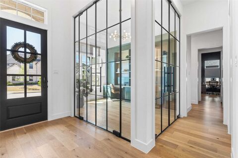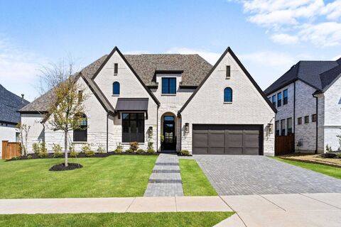 Stunning, like-new single-story Highland Plan 292 on a 74 ft. lot in award-winning Mustang Lakes, this home zoned to Prosper ISD. Impeccably maintained with designer finishes throughout. Upon entry, a striking glass-enclosed study makes a statement. Three spacious secondary bedrooms are positioned at the front, two with en suite baths. The home opens to a grand living area with soaring cathedral ceilings, decorative beams, abundant natural light, and a gorgeous fireplace as the focal point. The chefs kitchen features Taj Mahal quartz with a waterfall island, brushed gold plumbing fixture, brushed bronze hardware, double ovens, gas cooktop, built-in microwave, and ample cabinetry with pull-out drawers and spice racks, perfect for prep or entertaining. Additional living space includes a separate game and media room. Retreat to a tucked-away primary suite with a sitting area and spa-like bath. Enjoy a spacious backyard with a covered patio, an ideal canvas for your dream outdoor oasis. C